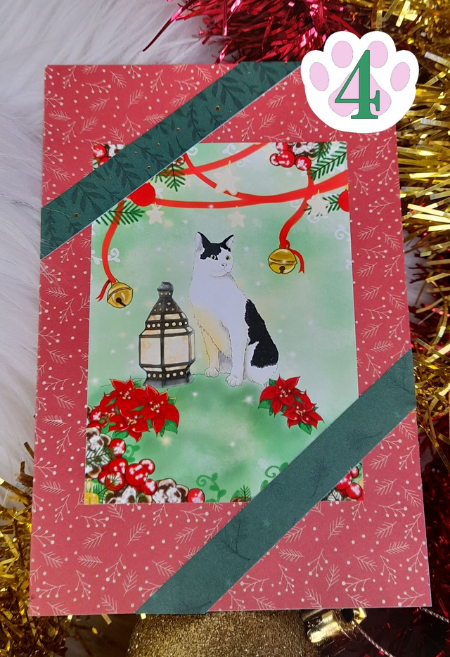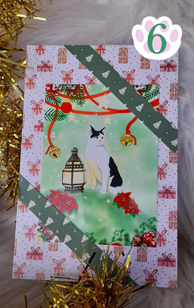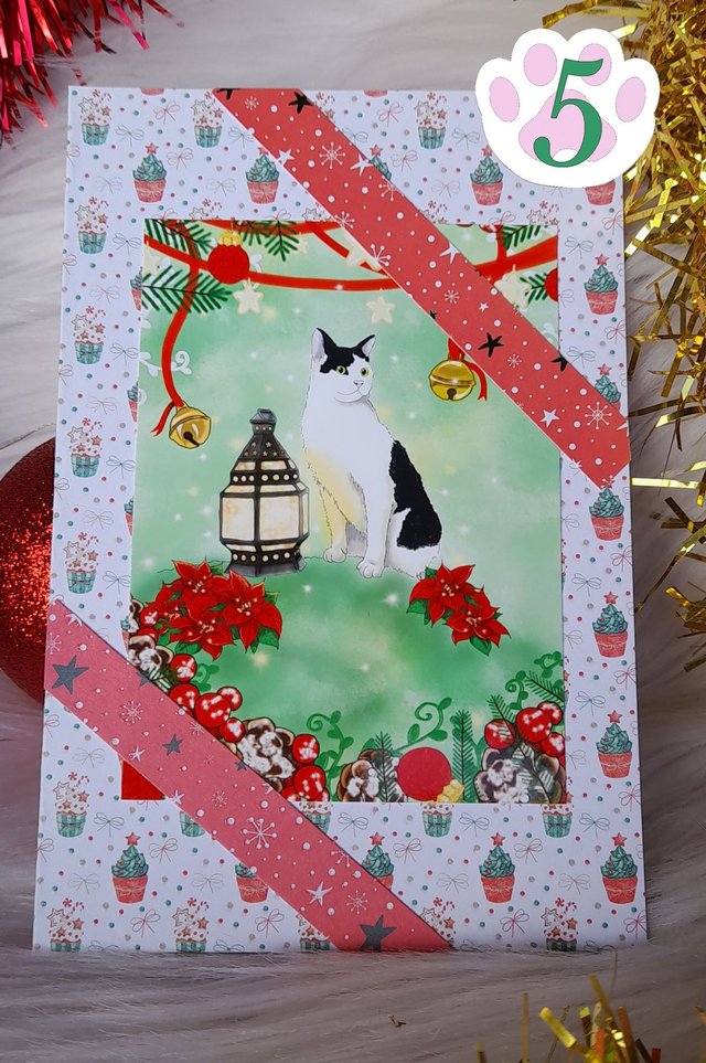 Carte de voeux de noel, chat noir et blanc, grelots et poissentat.